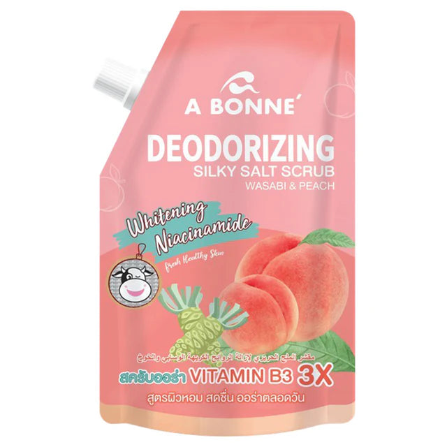Experience radiant, refreshed skin with the A Bonne Wasabi & Peach Silky Salt Scrub. This luxurious silky salt exfoliant with a peach fragrance is crafted with natural wasabi extract and fruit-based ingredients, leaving your body deeply cleansed and energized. Enriched with vitamin B3, it supports skin whitening and exfoliating while effectively eliminating dullness and rough patches.