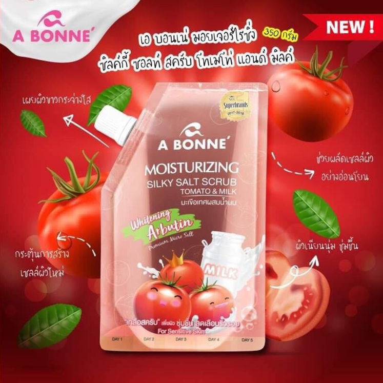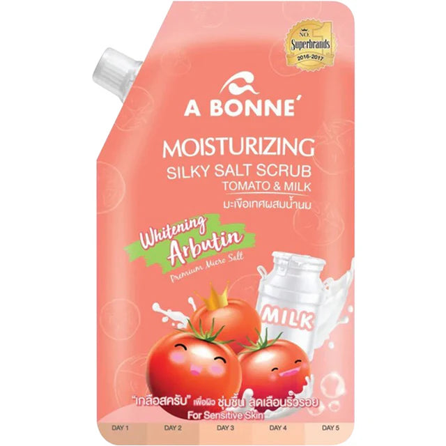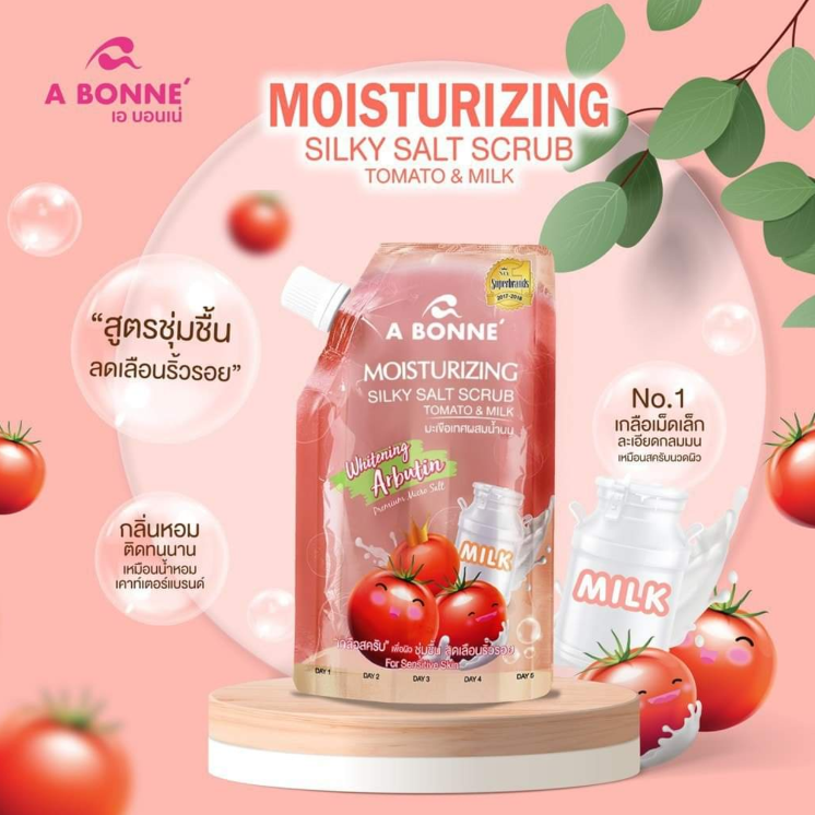 Experience smoother, brighter skin with the A Bonne Silky Salt Scrub Tomato & Milk, a nourishing moisturizing salt scrub 350g designed to deeply exfoliate and hydrate. Made in Thailand, this tomato & milk body scrub combines natural ingredients to gently remove dead skin cells and promote a soft, luminous glow. The formula includes whitening salt scrub with arbutin, known to visibly improve uneven skin tone and help fade scars, stretch marks, and dark areas.