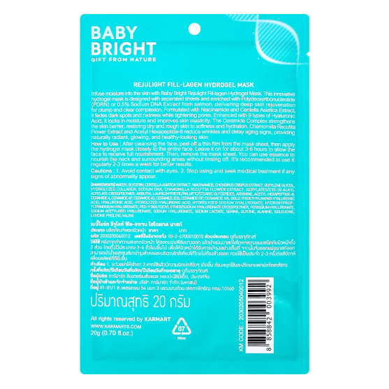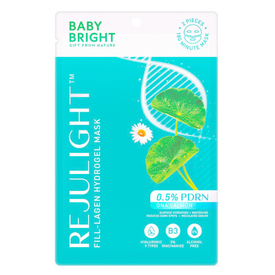 The Baby Bright Rejulight Fill-lagen Hydrogel Mask offers a unique solution to hydrate and rejuvenate your skin. This hydrogel face mask is crafted with separated sheets and is infused with 0.5% Polydeoxyribonucleotide (PDRN), a powerful Sodium DNA extract derived from salmon, to deeply nourish and revitalize the skin. Designed to provide a comprehensive anti-aging face mask experience, it helps improve the skin's elasticity, making it feel firmer and more youthful. With the combined benefits of Niacinamide and Centella Asiatica Extract, it visibly lightens dark spots and reduces redness, while tightening pores for smoother skin.