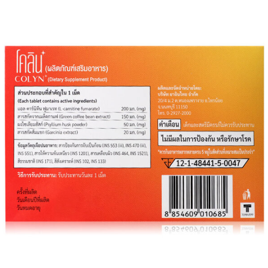 Yanhee - Colyn - L-Carnitine, Green Coffee, Psyllium Husk and Garcinia (20 Capsules x 2pcs)